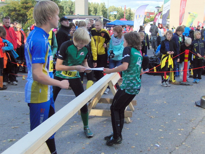 Eemeli lähettää Miskan ankkuriosuudelle    B-sarjassa Kuvan Lassi aloitti todella vauhdilla tulemalla vaihtoon kärkiletkassa seitsemäntenä. Sen jälkeen sijaluku asettui 30.-40. välille (joukkueita yli 90). Maalissa ykkösjoukkue oli sijalla 37. Kakkonen oli sijalla 52. ja kolmonen sijalla 59. Harmillisen kuvion toi yhden leimasimen varastaminen. Kuvan Lassilla se oli viides rasti ja hän sanoi vähän aikaa ihmetelleensä, mutta löytäneensä rastiprikan ja siitä päätelleensä, mitä oli tapahtunut.