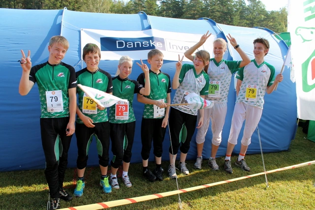 Upea kakkosjoukkue juoksujärjestyksessä vasemmalta        Kolmonenkin hätyytteli seuran 3-joukkueiden aiempaa ennätystä edelliseltä vuodelta 76. Nyt tuloksena upea sijoitus 78 joukkueessa suunnistivat Verneri Nieminen, Iiro Kuusela, Ella Hyvärinen, Lassi Kuva, Krista Tuominen, Elina Immonen ja Juho Kuoppamäki. Verneri aloitti hyvin ja juoksi vähän Ollin ja Miskan perässä vaihtoon. Iiro ei ollut järin tyytyväinen suunnistukseensa, mutta nosti kuitenkin joukkueen sijoitusta. Ella suunnisti kolmososuuden 10:ksi nopeimman ajan. Lassi suunnisti Nuju-ensikertalaisena hienosti 14-vuotiaiden osuutta. Krista tsemppasi myös hyvän kisan. Elina oli iloinen juoksun kulkemisesta lähes loppuun asti. Vielä tärkeämpää oli kuitenkin sujuva suunnistus vaativalla radalla. Juho suunnisti myös hyvin. Vain yksi vähän isompi virhe mahtui matkaan.