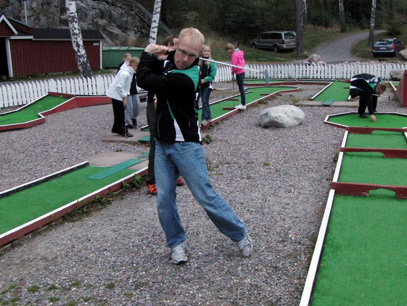 Kisan jälkeen suunnattiin Airistolle. Osa majoittui mökkeihin toisten päästessä/joutuessa hotelliin. Pääsystä/joutumisesta oltiin montaa mieltä. Kaikki majoitukset olivat erinomaisia tarkoitukseensa ja Hotelli Airisto Strandin palvelu kiitettävää jo varauksen hoidosta alkaen.     Mahtavan maukkaan makaronilaatikon jälkeen kokoonnuttiin rantaan pelaamaan minigolfia. Tosin sitä ennen ihasteltiin meduusoja meressä. Hotellin ja Satamakaupan henkilökunta tekivät jonkin verran töitä ja saivat kaikille mailat ja riittävästi palloja. Ilo oli ylimmillään ja lopulta tuli pimeys. Viimeiset reiät pelattiin jo melkein kuulopelinä. Tosin Harri laittoi kännykkänsä reiän taakse tähtäysmerkiksi Otsolle. Kops – hyvin toimi tähtäysmerkki ja täysosuma näyttöön. Palloa ei nähnyt välillä lainkaan. Lopuksi saunottiin ja käytiin nukkumaan.