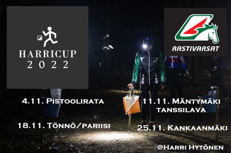 Harricup 2022Perinteikäs Harricup (Harrikuppi) tulee tänäkin vuonna jälleen. Yösuunnistusta koko marraskuun ajan perjantai iltaisin. Rastivarsat järjestävät 4.11-25.11.2022 neljänä peräkkäisenä perjantai-iltana yösuunnistus kisasarjan.     Kisasivuille tästä.